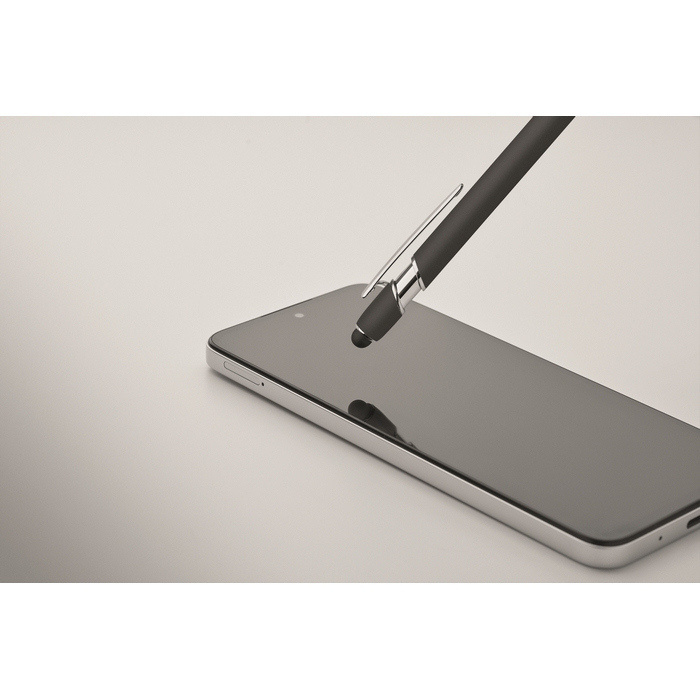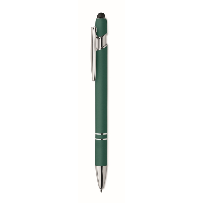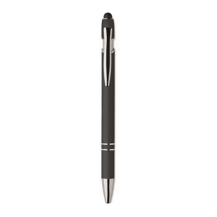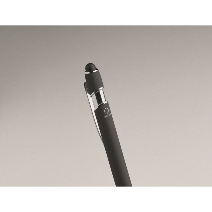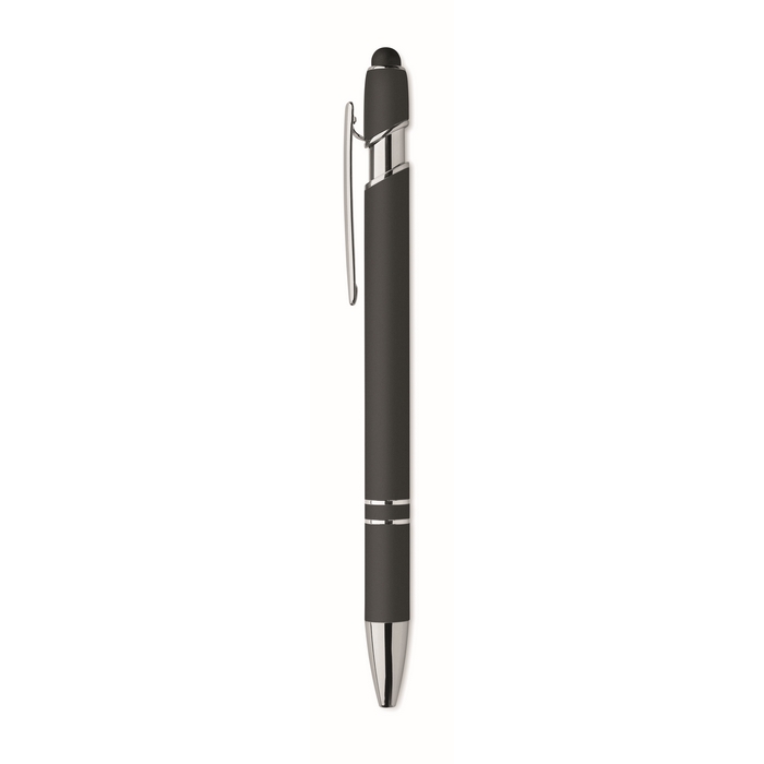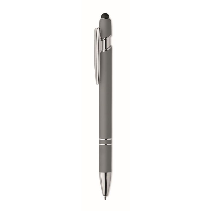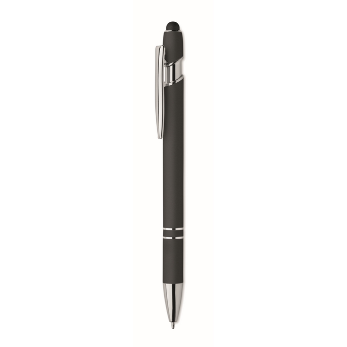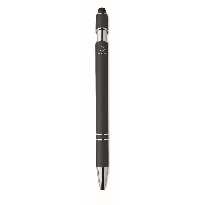 Caneta de alumínio reciclado com acabamento de borracha e tinta azul para uso diário confortável no escritório ou eventos. O corpo metálico oferece uma sensação firme na mão e o revestimento suave melhora a pega na escrita de longa duração. A tinta azul facilita a leitura clara em notas, formulários e documentação interna. Formato prático para ter em reuniões, feiras ou visitas comerciais. Recomendada como acessório de marcação em ações corporativas, packs de boas-vindas e campanhas de angariação.