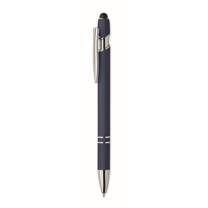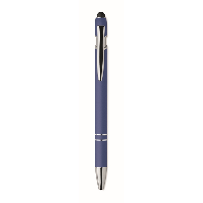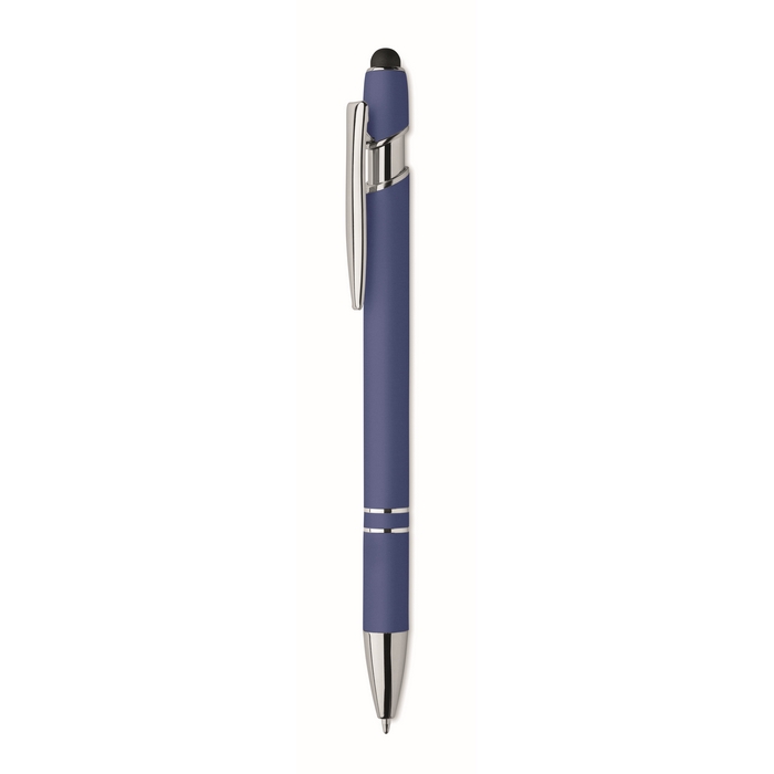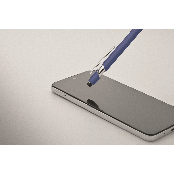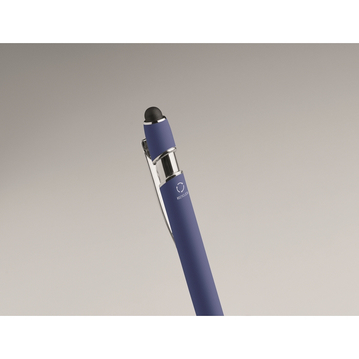 Caneta de alumínio reciclado com acabamento de borracha, tinta azul