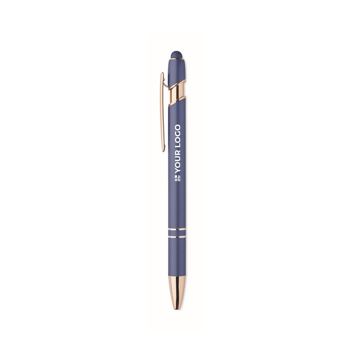 Caneta styllus em alumínio reciclado com detalhes em ouro rosa. Tinta azul.