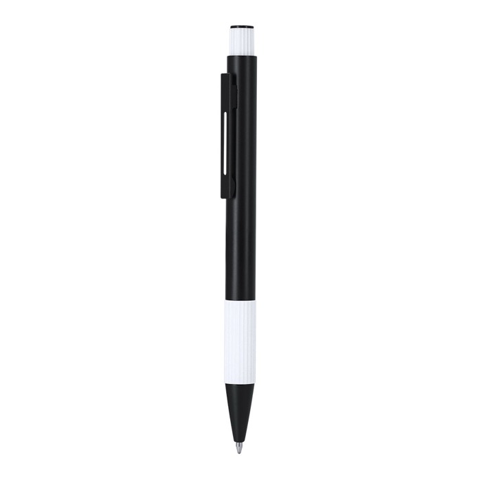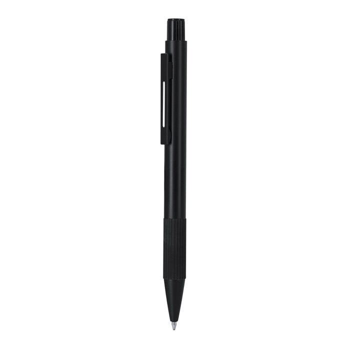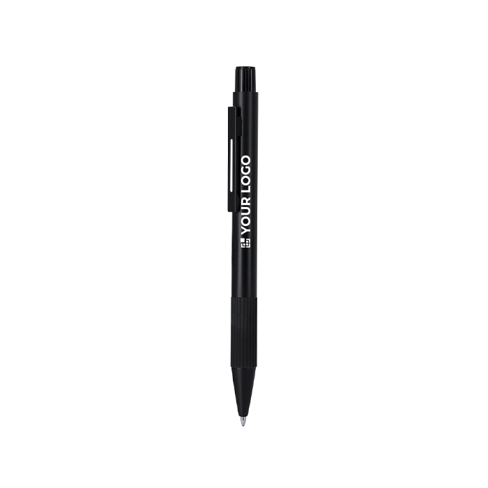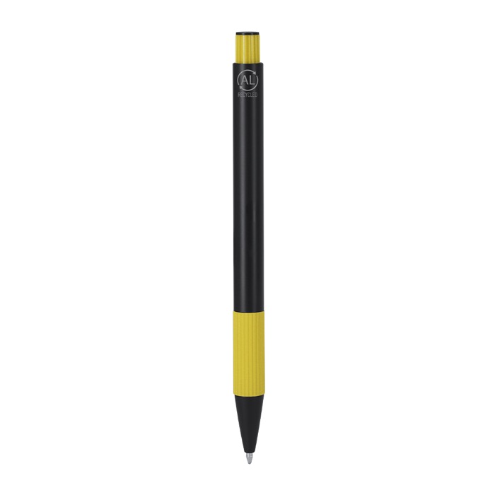 Caneta com corpo de alumínio reciclado e pega com acabamento de borracha texturizada para uma preensão mais firme. Dispõe de mecanismo de botão para uso ágil no dia a dia e cartucho jumbo, pensado para alongar a escrita. A tinta azul oferece um traço regular para notas, formulários e trabalho de escritório. Inclui selo de alumínio reciclado, útil para identificar o material do artigo. Recomendada para ações de marca em feiras, formações ou boas-vindas a colaboradores.