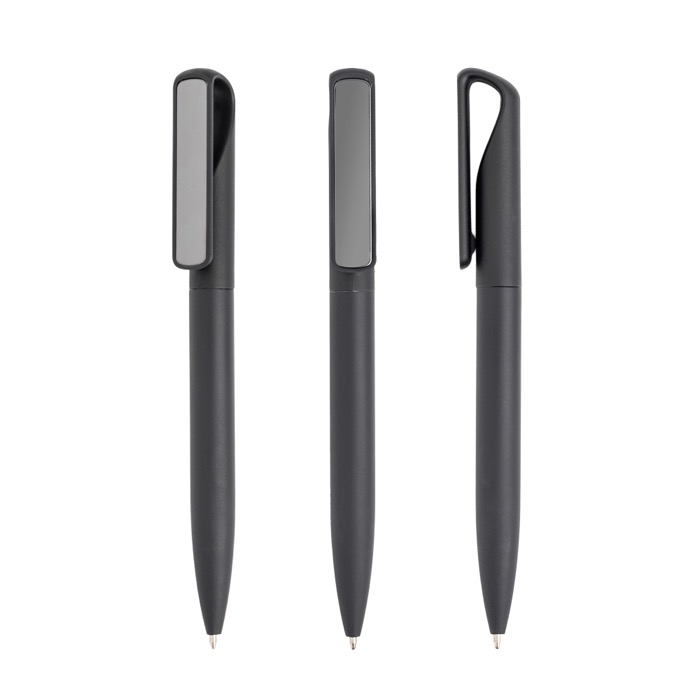 Caneta acabamento borracha clipe metálico efeito espelho, tinta preta