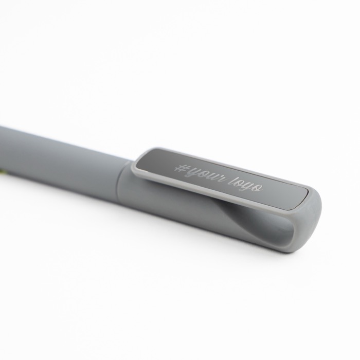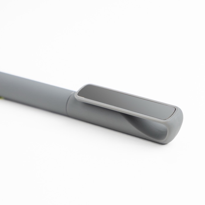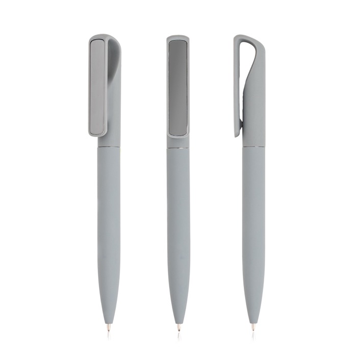 Caneta elegante com acabamento de borracha que proporciona uma pega confortável. Inclui clipe metálico com efeito espelho e escrita com tinta preta, juntando estilo e funcionalidade para uso diário.