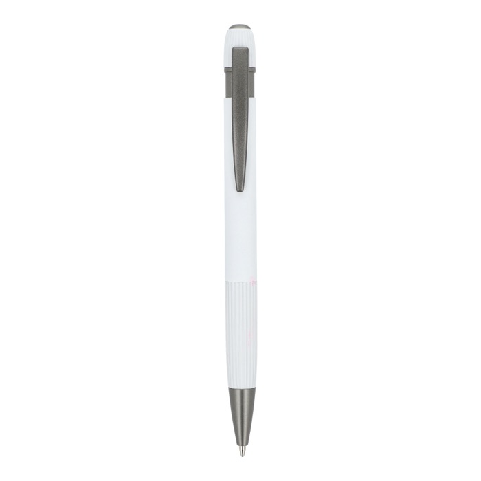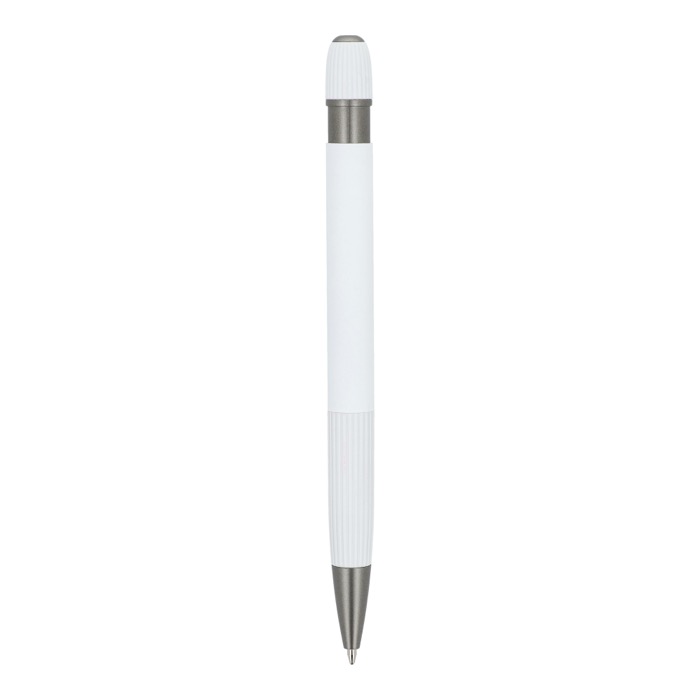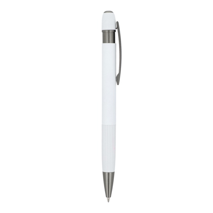 Caneta de alumínio com clipe metálico, pensada para uso diário no escritório e ações de comunicação. Dispõe de riscas verticais no corpo e no botão que melhoram a pega e lhe conferem um acabamento cuidado. O mecanismo de botão facilita o uso rápido em reuniões, receções ou formações. Entregue com escrita a tinta azul, adequada para assinaturas e notas habituais. Opção prática para personalizar com o logo e redobrar a presença de marca em eventos corporativos.