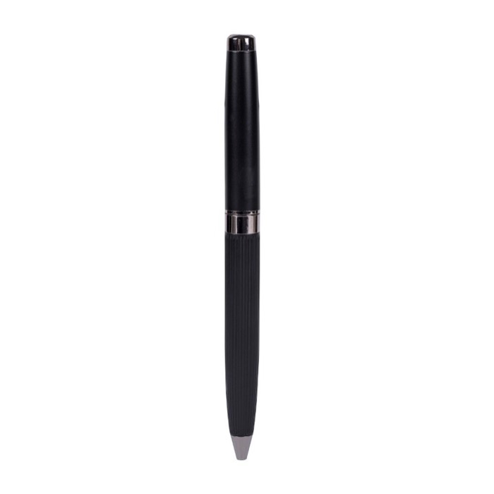 Conjunto de escrita elegante que combina uma caneta giratória de metal e tinta azul com um estojo de PU a condizer. Entregue em caixa-oferta.