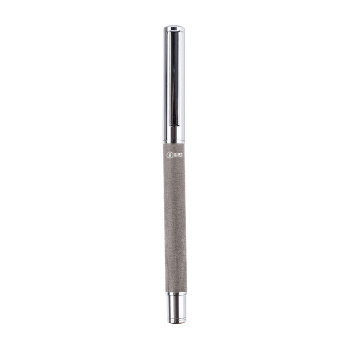 Distinto roller de latão e RPET com tinta azul, clip e pega metálicos. Transmite uma imagem profissional e sustentável em cada traço.