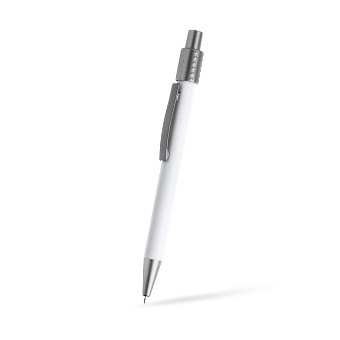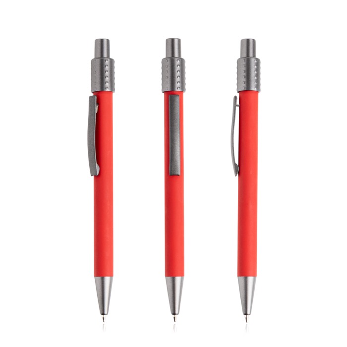Esferográfica de alumínio com acabamento emborrachado para uma escrita confortável no dia a dia. Integra ponta e botão de pressão em plástico e um clipe em aço inoxidável que melhoram a resistência e dão um aspeto atual no escritório ou na feira. Na parte superior, incorpora um spinner pensado para aliviar o stress enquanto toma notas ou espera por uma reunião. Inclui tinta azul com recarga tipo JUMBO e um peso leve de 15g, fácil de levar no bolso ou na credencial. Recomendada para ações de marca e brindes empresariais.