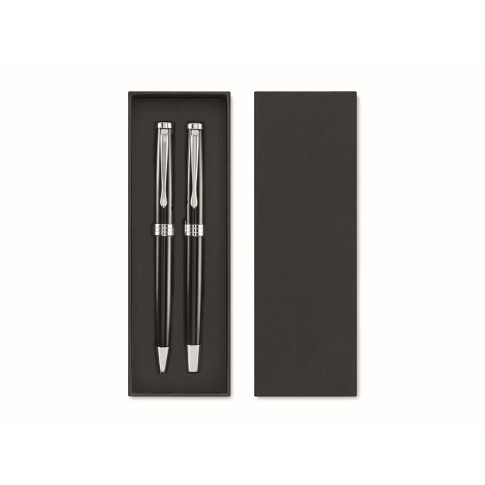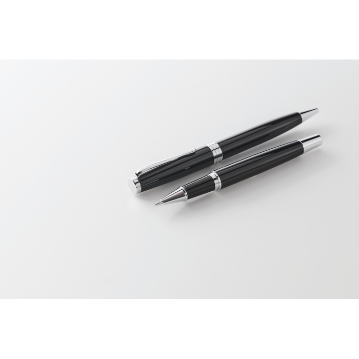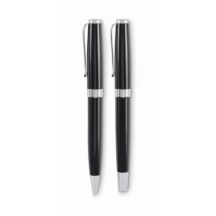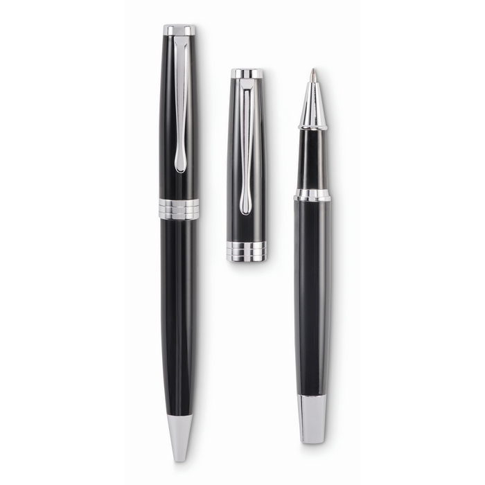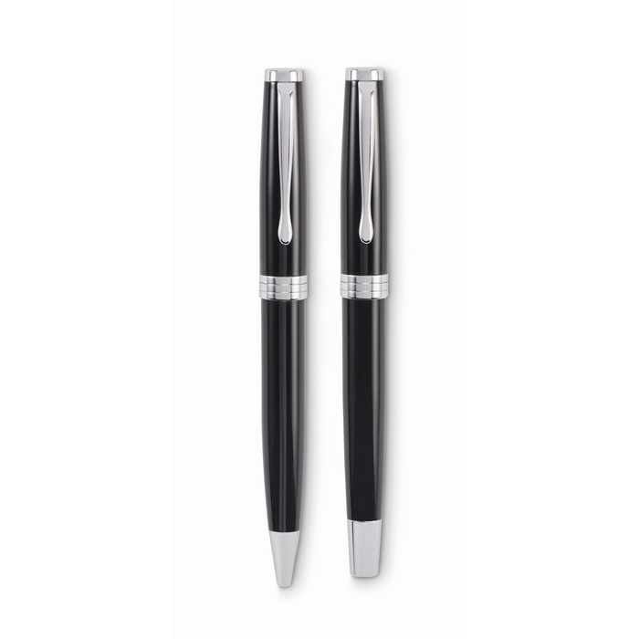 Conjunto de caneta e roller com corpo de aço inoxidável reciclado. Tinta azul e preta, respetivamente. Entregue em estojo.