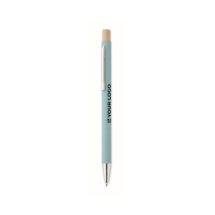 Caneta em alumínio reciclado com botão de pressão em bambu. Ponta e clip prateados. Tinta azul.
