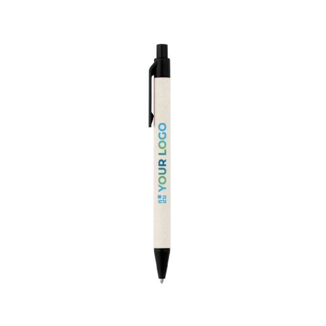 Caneta promocional feita de pacotes de leite reciclados. Tinta azul para escrita fluída e design leve para a levar sempre consigo no estojo.