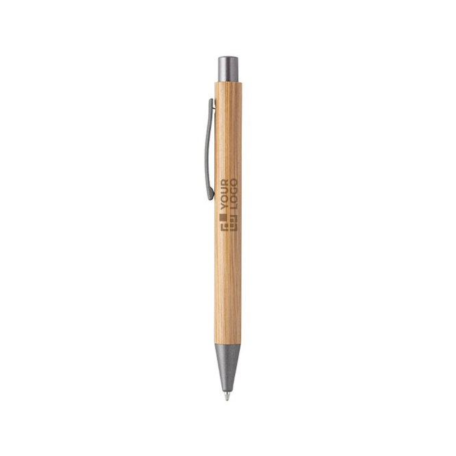 Estilo contemporâneo: caneta de bambu com clip de metal, acabamento cinza e tinta azul. Fusão de modernidade e sustentabilidade para o merchandising da sua empresa.