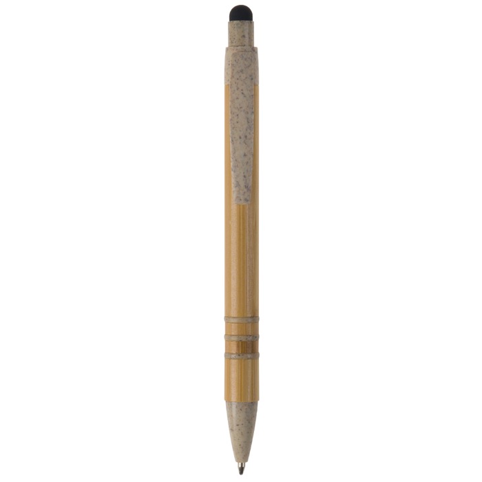 Caneta feita de bambu. A ponta, o clipe, o botão e os anéis do corpo são de palha de trigo. No botão há um lápis ótico colorido para utilizar os ecrãs dos smartphones. Um brinde publicitário sustentável e divertido para oferecer.