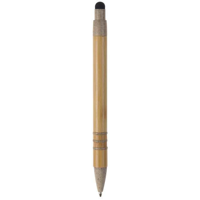 Caneta com componentes de bambu e palha de trigo, inclui uma ponta táctil colorida para dispositivos tácteis. Um brinde para eventos promocionais.