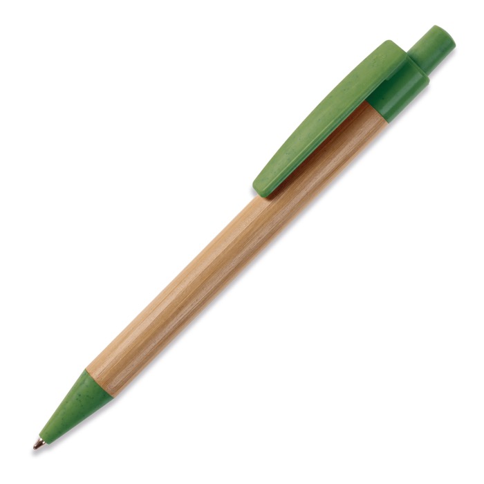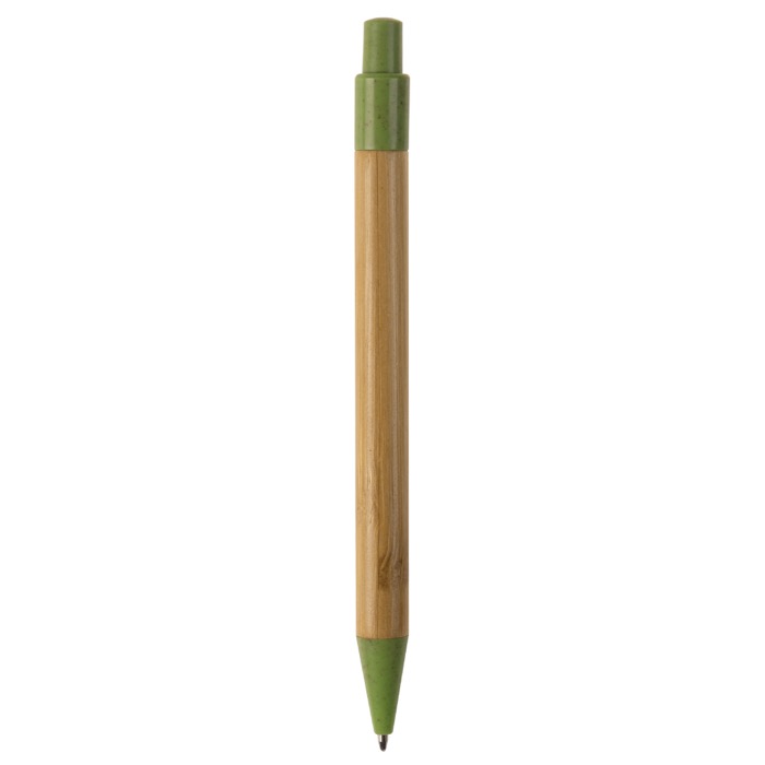 Esta caneta combina materiais naturais: corpo de bambu, detalhes de palha de trigo. Dispõe de uma recarga plástica azul para uma escrita fluida.