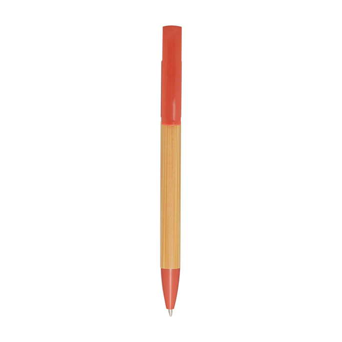 Esferográfica de bambu que também funciona como suporte para smartphone. O botão e o anel central são de plástico reciclado, a ponta é de latão e o corpo é de bambu de origem responsável. Cor da tinta: Azul. Comprimento de escrita: 1000 metros. Tamanho do bico: 1,0 mm.