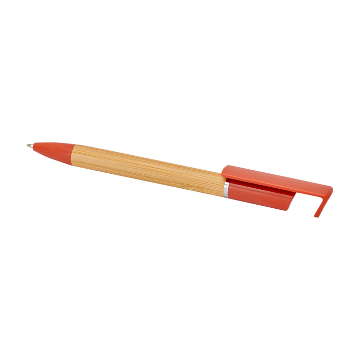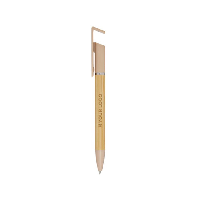 Caneta de bambu e suporte para telemóvel. Combina estilo e funcionalidade num só acessório. Um toque publicitário criativo para qualquer evento.