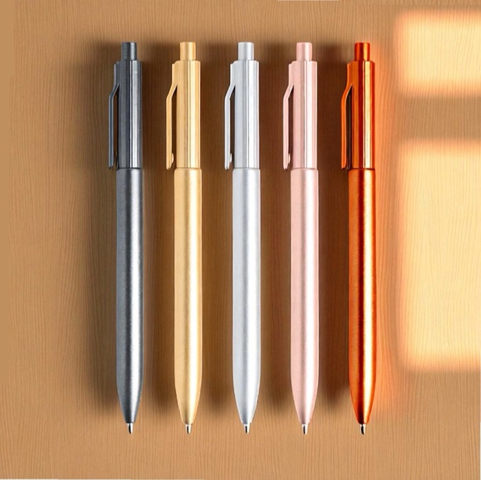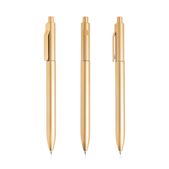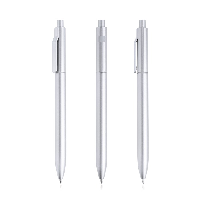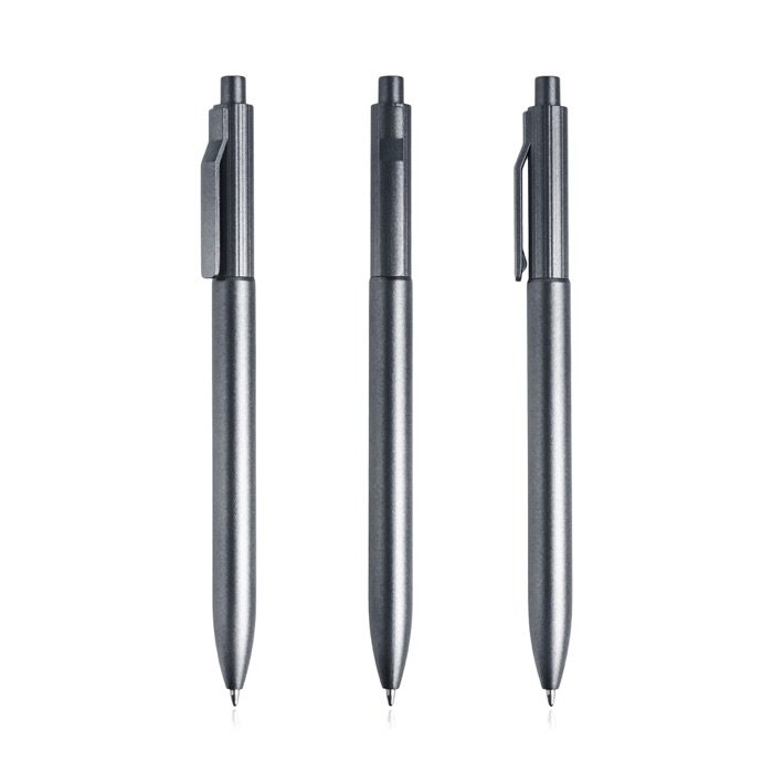 Caneta feita de ABS reciclado, com um design funcional que transmite compromisso com a sustentabilidade. A parte superior exibe linhas em relevo que ocupa aproximadamente um terço do comprimento e inclui o clipe de forma elegante. Equipada com mecanismo de botão e tinta preta, é uma opção prática e fiável para uso diário. As cores metálicas dão-lhe um toque sofisticado, ideal quer para ambientes profissionais como para brindes publicitários estilosos.