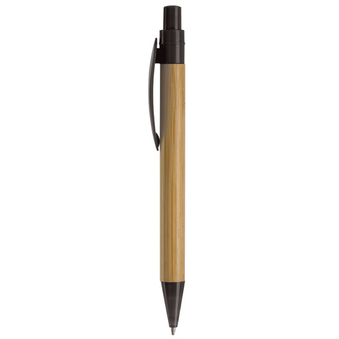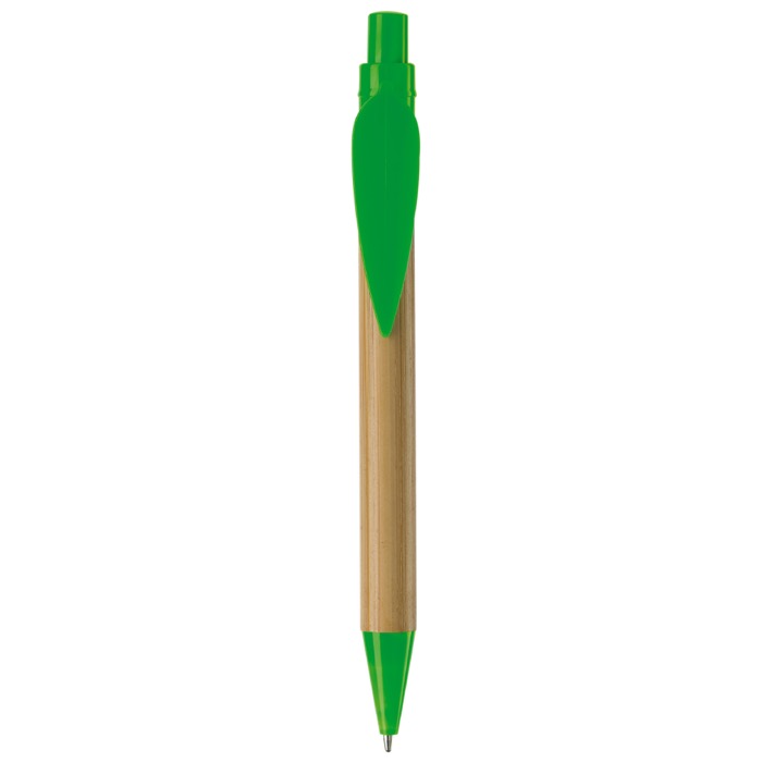 Caneta ecológica de bambu com clipe em forma de folha. Botão e parte inferior coloridos. Recarga X20, escrita azul.
