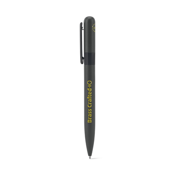 Esferográfica em metal (60% reciclado), com design arredondado para uma sensação de escrita harmoniosa. Possui um clipe, mecanismo twist e escrita a preto. Fornecido em caixa de oferta em papel kraft, feita de um material certificado FSC™ e outros materiais controlados.