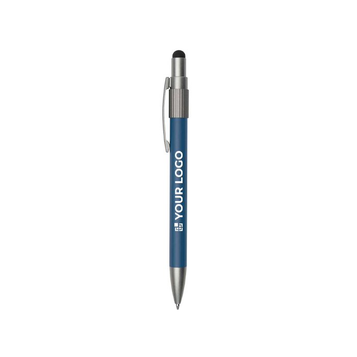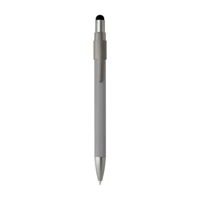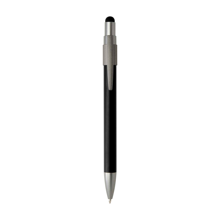 Caneta de alumínio reciclado com ponteira stylus e jogo giratório na parte superior, pensada para alternar entre a escrita e o uso em ecrãs tácteis. Dispõe de mecanismo de pressão para manuseamento rápido no dia a dia e parte giratória anti-stress ativada com um simples movimento. Oferece escrita fluida com tinta azul e comprimento de escrita aproximado de 1000 m para uso prolongado. Adequada para entregas em feiras, ações de RH e material de escritório com logo.