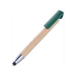 Esferográfica de bambu e ponteiro táctil. Suporte é feito de bambu, a ponta e o clip são de plástico. O clipe funciona como o botão de pressão e serve como um suporte para telemóvel. Escrita azul.