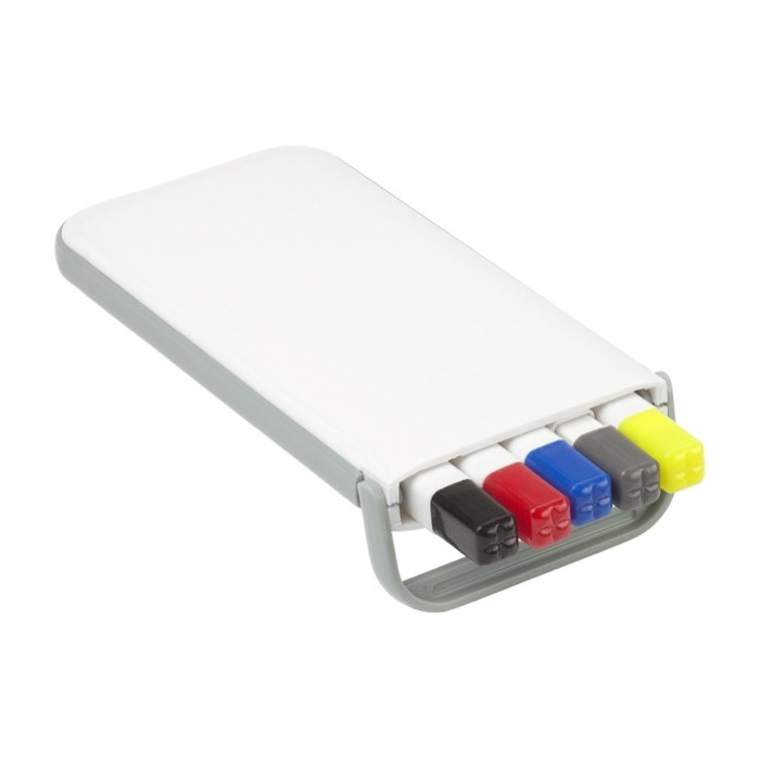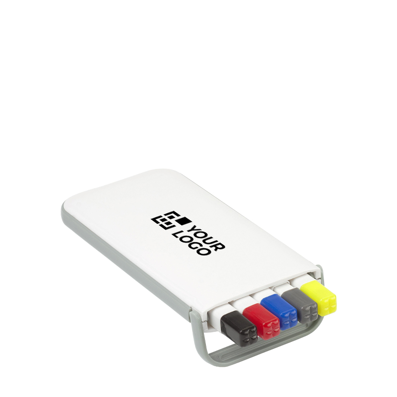 Estojo de plástico branco com 3 esférograficas, 1 marcador flourescente e 1 lapiseira. Levantando automaticamente quando a tampa é movida.