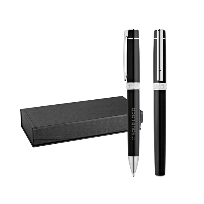 Conjunto de escrita que inclui uma esferográfica e um roller. É um brinde de empresa clássico que transmite profissionalismo e experiência aos clientes.
