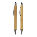 Este moderno conjunto de caneta e lápis é feito de bambu certificado FSC®. A caneta conta com uma recarga de escrita de 800 m com tinta alemã azul e o lápis com uma mina de 0,7 mm. Apresentado em caixa-oferta com certificação FSC®.