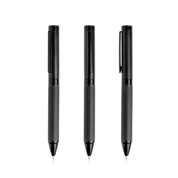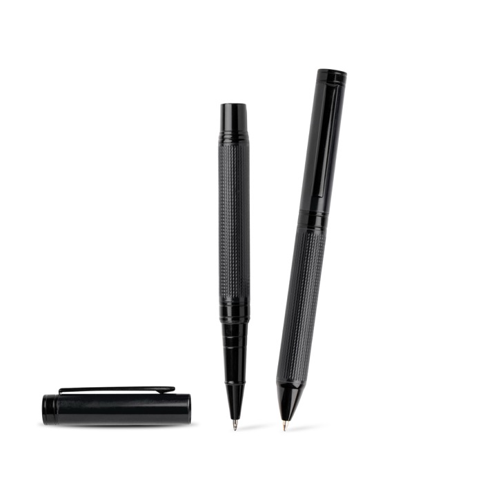 Conjunto de caneta e roller de aço e alumínio com relevo, tinta preta