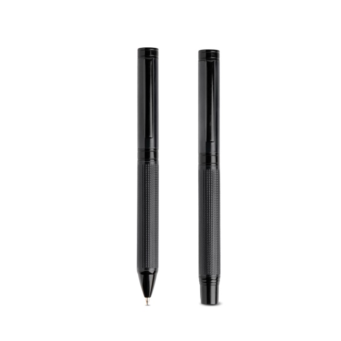 Conjunto de caneta e roller com parte superior de aço inoxidável lacado e parte inferior de alumínio com textura em relevo para uma pega ergonómica. Detalhes de metal preto que reforçam a estética premium. Entregue num estojo preto de cartão duro com interior com almofada de veludo preto, protegido com capa branca para transporte seguro. Escrita azul. Ideal para brindes empresariais ou ocasiões especiais.