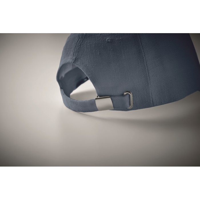 Boné de basebol com aba em tecido 100 % em cânhamo de 370 gr/m², com clipes de latão no fecho da alça ajustável. Com 5 ilhós cosidos na cor correspondente. Tamanho 7 1/4.