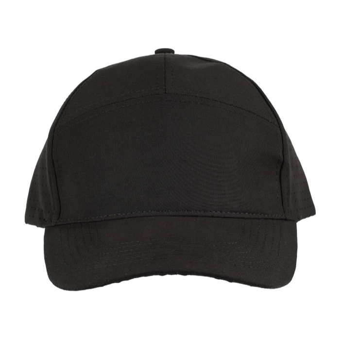 Boné em poliéster com orifícios de ventilação cortados a laser nos painéis traseiros. Apresenta um desenho de 7 painéis com um painel à frente e uma pala de 7 cm. Ajustável e respirável, sem etiqueta PU.