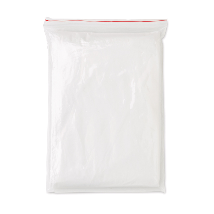 Poncho dobrável em material biodegradável e também embalado em saco biodegradável.