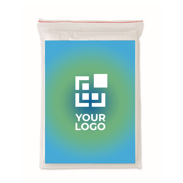 Estas capas de chuva com logotipo são apresentadas numa bolsa, para que possam ser dobradas. Além disso, destacam-se por serem biodegradáveis.
