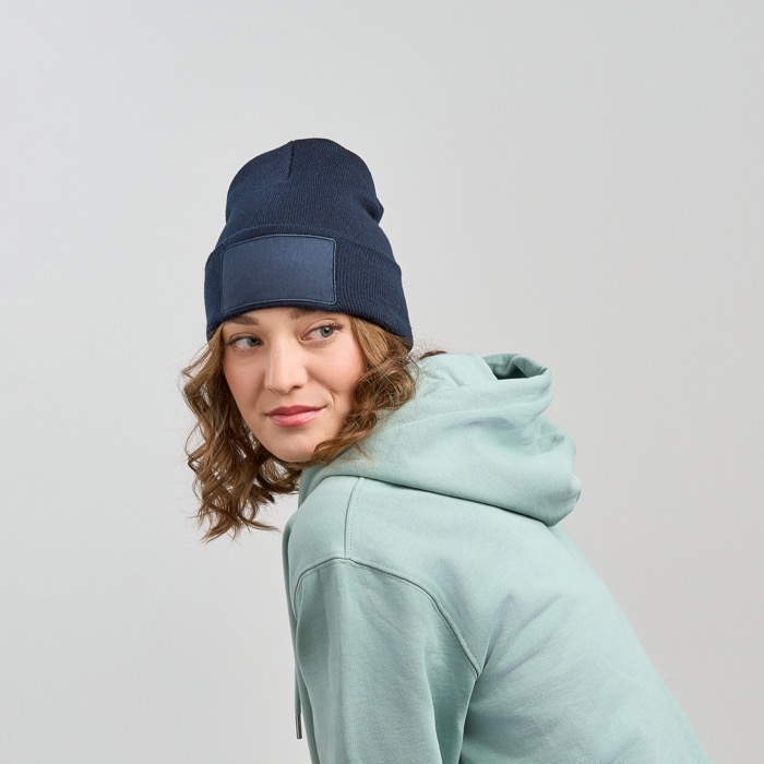 Gorro clássico para uso diário de poliéster reciclado com bainha, camada dupla, acabamento circular à máquina e patch para personalização. 100% poliéster reciclado.