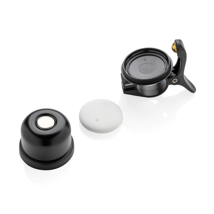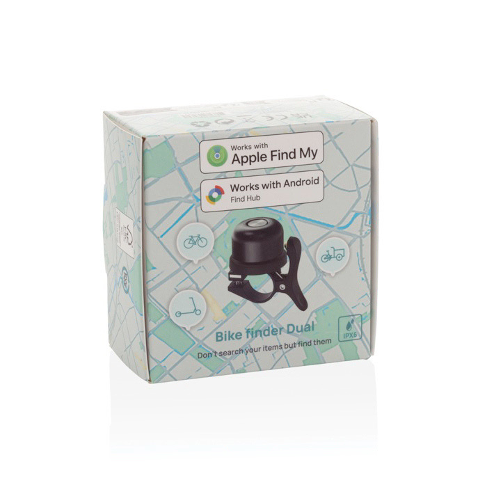 Campainha localizadora para bicicleta com tecnologia de seguimento incluída para saber onde está a bicicleta no dia a dia. Compatível com Encontrar da Apple e Find Hub Android. Permite receber avisos caso se esqueça dela e consultar a localização através de redes compatíveis. Quando estiver perto, pode reproduzir um som para afinar a localização. Dispõe de proteção IPX5 para uso com chuva e bateria de longa duração até 12 meses sem precisar de a trocar. Útil para ações de fidelização, eventos e campanhas de mobilidade urbana com o seu logo.