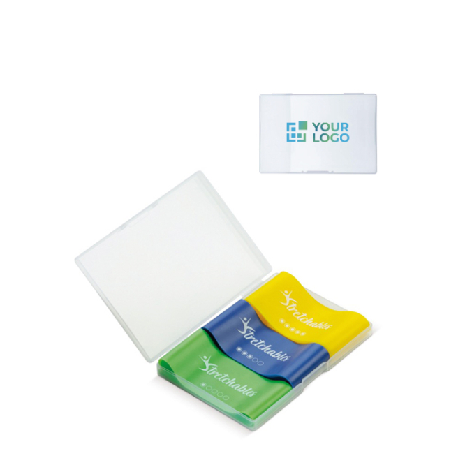 Este conjunto contém três bandas de resistência diferentes, um manual e um estojo. Cada banda tem o seu próprio nível de resistência: de leve a pesado. O nível é indicado com pontos nas bandas e devido à cor. Há alguns exercícios de exemplo no manual para que possa começar imediatamente o seu treino. Cada exercício é descrito em dois passos simples.