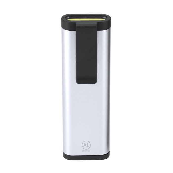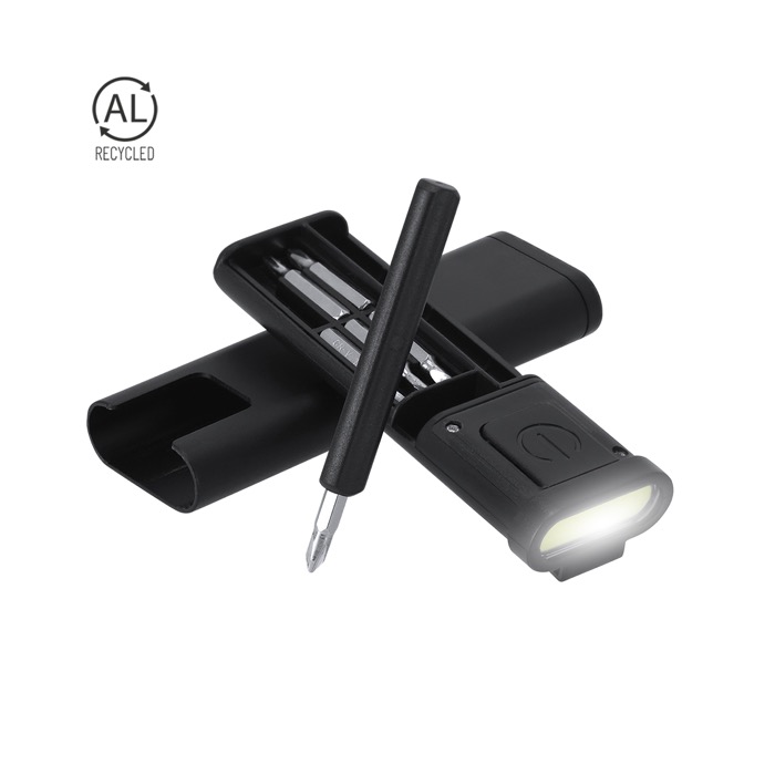 Conjunto de ferramentas de alumínio reciclado com formato compacto 2 em 1. O estojo em forma de lanterna inclui 4 luzes LED e 1 compartimento interior para guardar 6 ferramentas pensadas para resolver ajustes rápidos no escritório ou em deslocações. Inclui cabo multifunções compatível com ponta de estrela e plana para cobrir as utilizações mais comuns. O clipe torna-o fácil de levar no bolso ou mochila e as pilhas de botão estão incluídas para o usar desde o primeiro dia. Recomendado para ações de marca em eventos e boas-vindas de pessoal.
