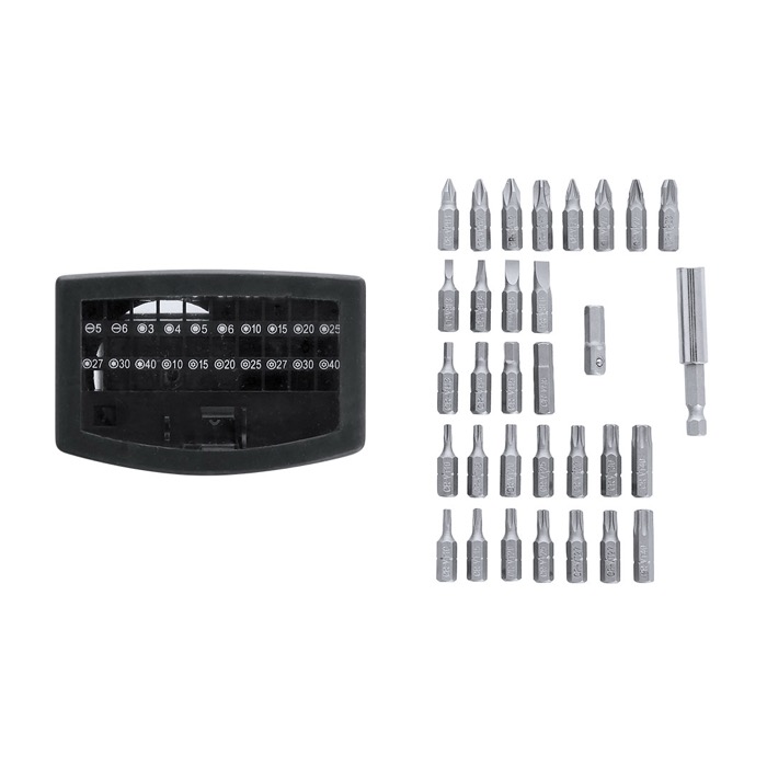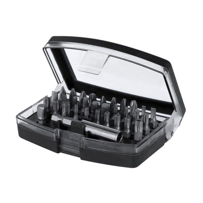 Conjunto de ferramentas com estojo de plástico, concebido para trabalhos de precisão no escritório, manutenção e apoio técnico. Inclui adaptador e 32 acessórios magnéticos com pontas várias: Phillips, estrela, planas, hexagonais e Torx para abranger a maioria dos parafusos comuns em dispositivos e equipamentos pequenos. O formato compacto serve para o ter ordenado e pronto na gaveta ou numa mochila. Boa opção para ações de RH, feiras ou merchandising empresarial com o seu logo.