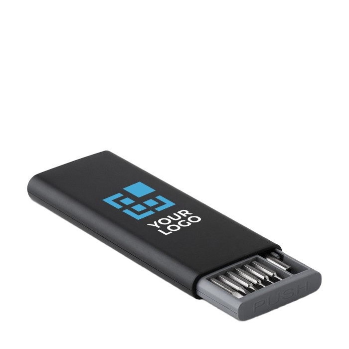 Um brinde publicitário para a bricolage da casa, que inclui várias chaves de parafusos de precisão e é personalizável na parte superior.
