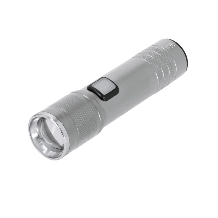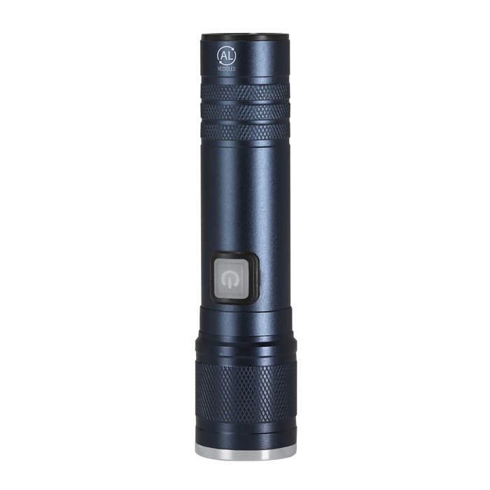 Lanterna de alumínio reciclado com acabamento mate e zoom extensível para ajustar o feixe de acordo com a situação. Inclui uma luz COB (chip on board) com três modos para adaptar a iluminação no armazém, eventos ou trabalho de campo. Conta com botão lateral ON/OFF e detalhes decorativos cromados. Recarregável por USB-C e inclui cabo de carga de 5 V, o que evita pilhas e simplifica a logística na empresa. Opção prática para ações de marca, boas-vindas a colaboradores ou material de apoio em feiras.