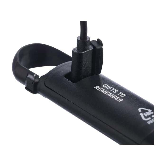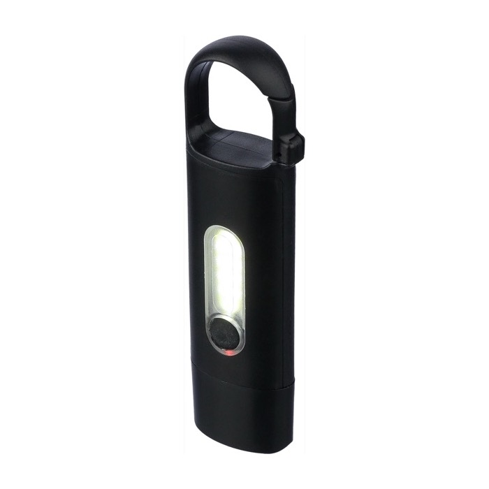 Mini lanterna em ABS reciclado com bateria recarregável por USB de 200 mAh incorporada e mosquetão. Inclui uma luz COB frontal e um projetor COB lateral com três modos de iluminação. Com cabo de carregamento USB-C e logótipo em ABS reciclado.