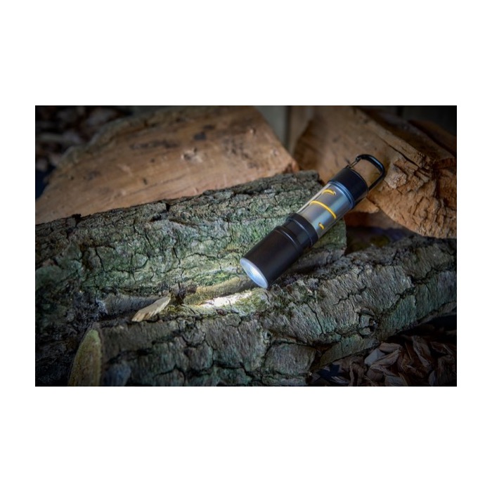 Lanterna COB em alumínio e liga metálica com caixa em ABS e clipe metálico na parte de trás. Inclui 3 funções de luz, modo de zoom e um mosquetão preto na parte superior. Alimentada por uma bateria de iões de lítio de 14.500-500 mAh com carregamento Tipo C. Fornece 130 lúmenes e inclui um cabo preto de 30 cm. Funcionamento com botão de pressão e base magnética. Embalada individualmente numa caixa de cartão castanha.