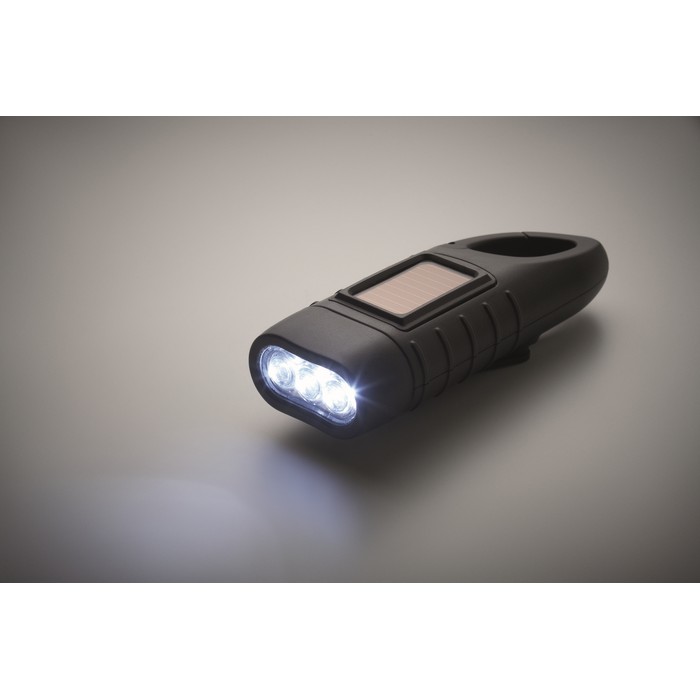 Lanterna solar com 3 LED. Recarrega via painel ou dínamo à manivela. Feita de ABS reciclado, é um brinde ecológico e muito prático para ter em casa ou no carro.