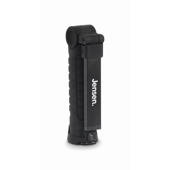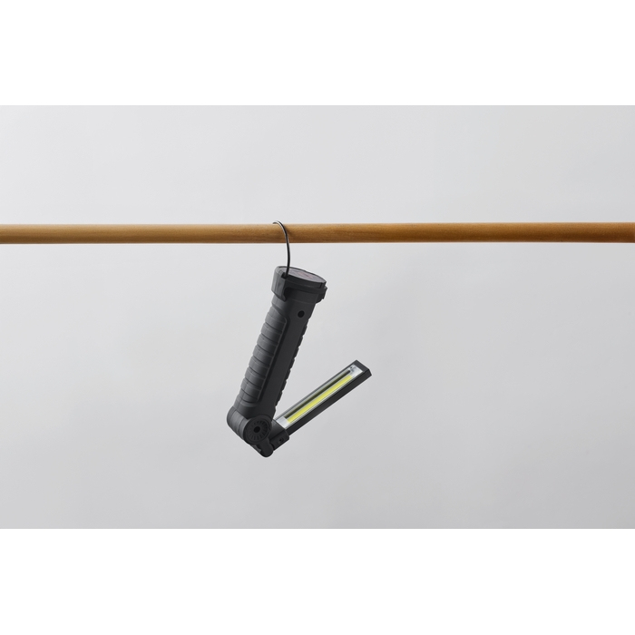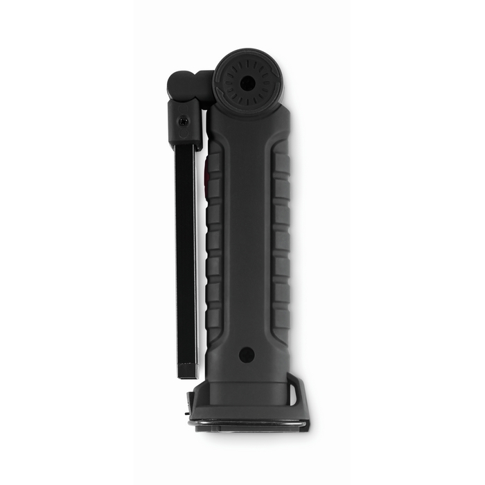 Luz de trabalho de alumínio recarregável com bateria de 1200 mAh, pensada para tarefas de manutenção e revisões em espaços com pouca luminosidade. Inclui corpo giratório 270º para orientar o feixe com precisão. Inclui luz de inspeção brilhante e uma luz lateral COB com dois modos, útil para iluminar áreas pequenas ou amplas. Inclui gancho para pendurar e base magnética para mãos-livres, além de cabo de carga. Ideal para kits de boas-vindas ou campanhas internas de segurança.