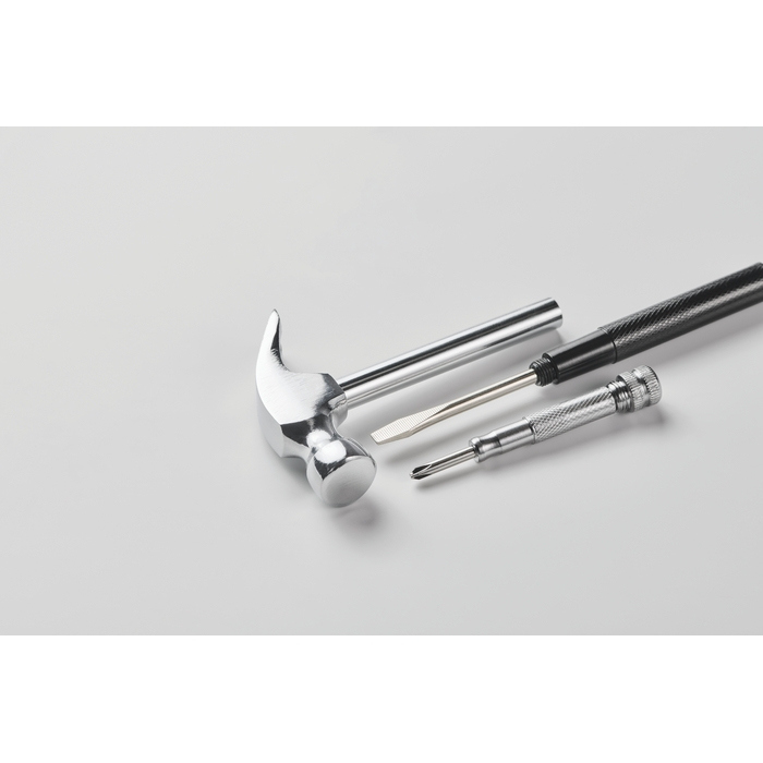 Martelo de aço ao carbono com garra e chave de fendas incluídas, pensado para tarefas de manutenção rápidas. A pega incorpora 4 pontas de chave de fendas, úteis para resolver ajustes simples sem mudar de ferramenta. A garra facilita a extração de pregos e o formato compacto ajuda a tê-lo sempre à mão na oficina, armazém ou carro da empresa. Opção prática para kits de boas-vindas técnicos, ações de fidelização ou brindes empresariais em feiras do sector industrial.