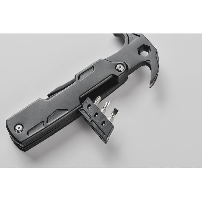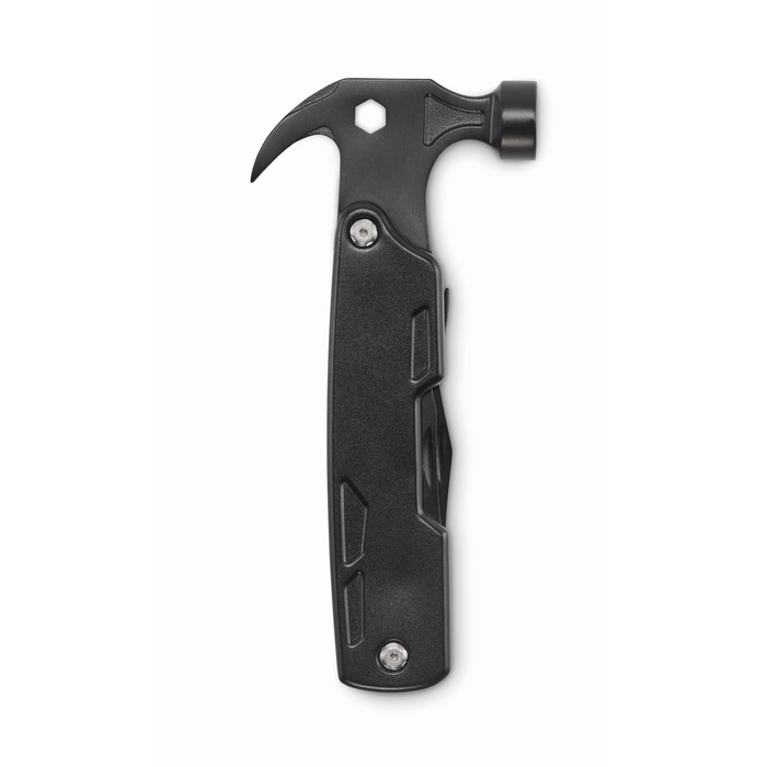 Martelo multiferramenta 14 em 1 de aço inoxidável com pega de alumínio, concebido para ter várias ferramentas à mão num só artigo. Inclui alicates, chaves de fendas e chaves inglesas para ajustes rápidos. Também integra lâmina, serra e corta-arames para trabalhos de corte simples. O abre-caricas completa o conjunto para uso quotidiano. Formato compacto e prático para ter em veículos ou kits de manutenção. Recomendado como brinde empresarial para feiras, equipas técnicas ou ações de boas-vindas.