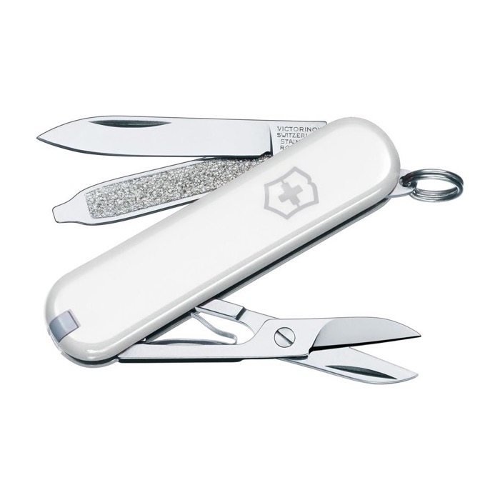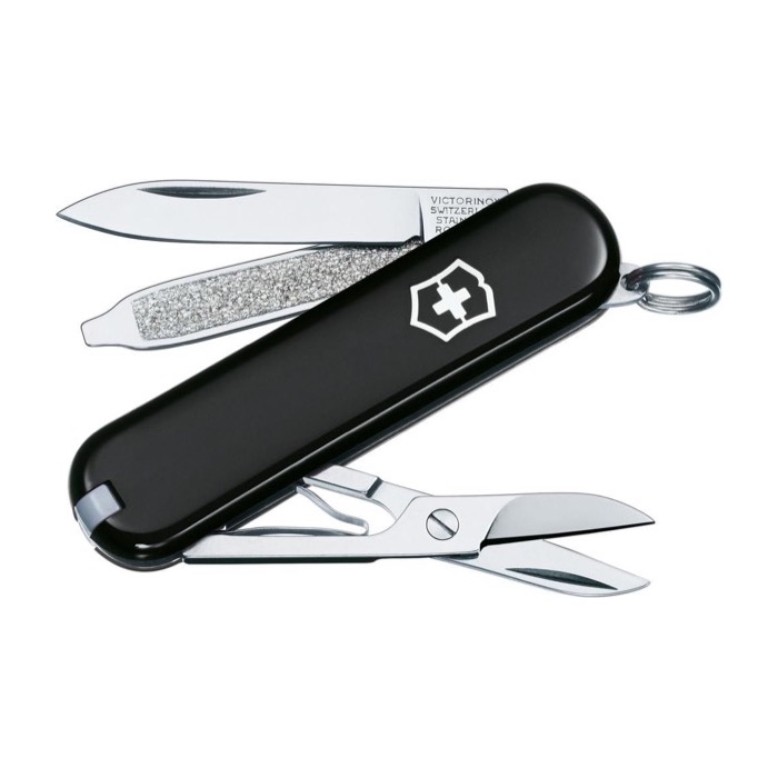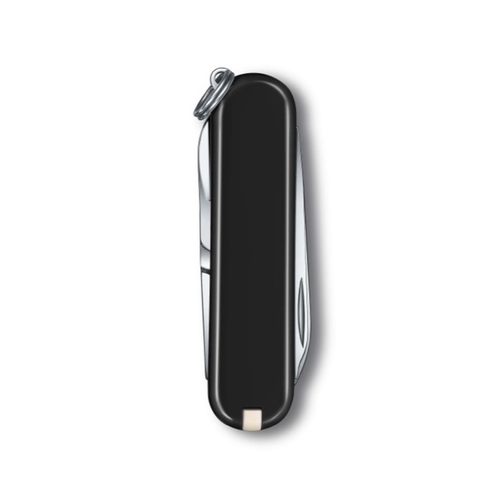 Canivete Victorinox com 7 funções: palito, tesoura, pinça, lima, chave de fendas (2,5 mm), porta-chaves e lâmina. Apresentado individualmente em caixa-oferta.