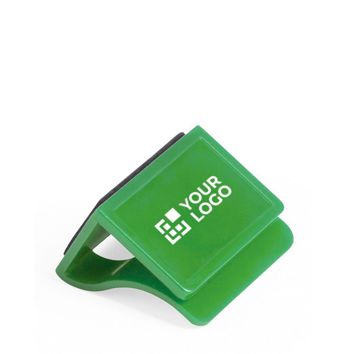 Este protetor de webcam, personalizável para publicidade, coloca-se na parte superior do portátil, como se fosse um clipe de papel, cobrindo a câmara.