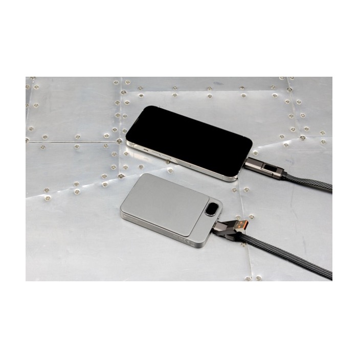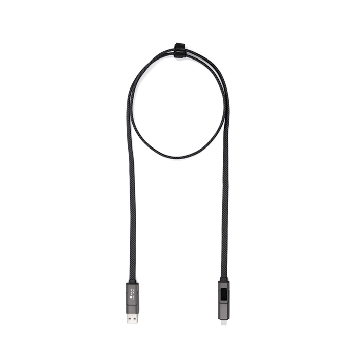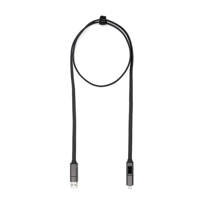 Cabo de nylon reciclado de 120 cm com design 4 em 1 para cobrir diferentes necessidades de carga e ligação no dia a dia. Inclui entradas USB-C e USB-A, oferecendo saídas USB-C e Lightning para dar conta de vários dispositivos com um só cabo. Suporta carga rápida até 65 W via USB-C a USB-C e permite também transferência de dados USB 2.0. Entregue sem embalagem individual. Pensado para uso intensivo no escritório, eventos ou como reclame de marca em ações corporativas.
