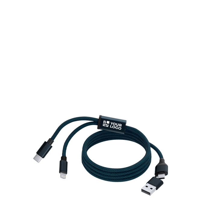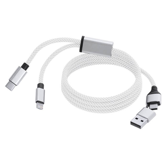 Cabo de carga com design com ímanes para evitar emaranhados e de alumínio resistente. Com ligação de entrada dual Tipo-C/USB e saídas Tipo-C e 2 em 1 (Lightning e Micro USB).